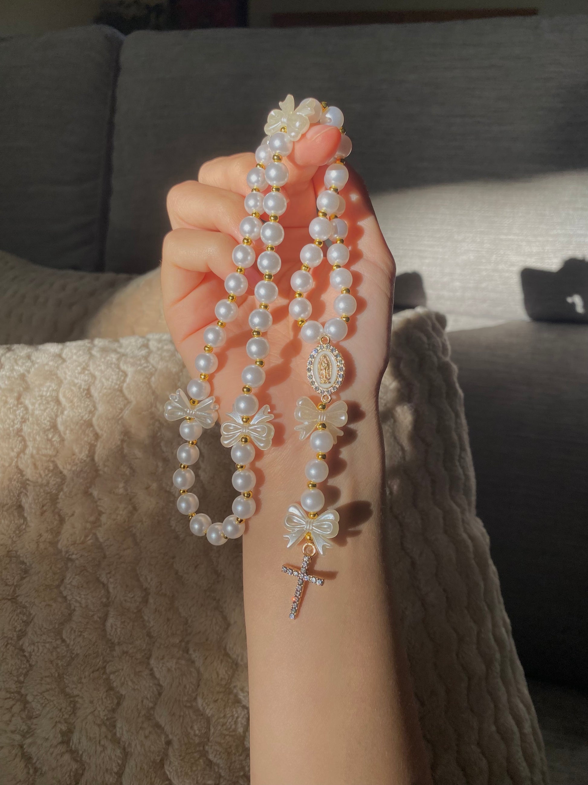 Ses perles blanches en forme de nœuds symbolisent les liens du cœur et la continuité de la foi, tandis que les reflets dorés rappellent la lumière divine et la douceur de la prière.