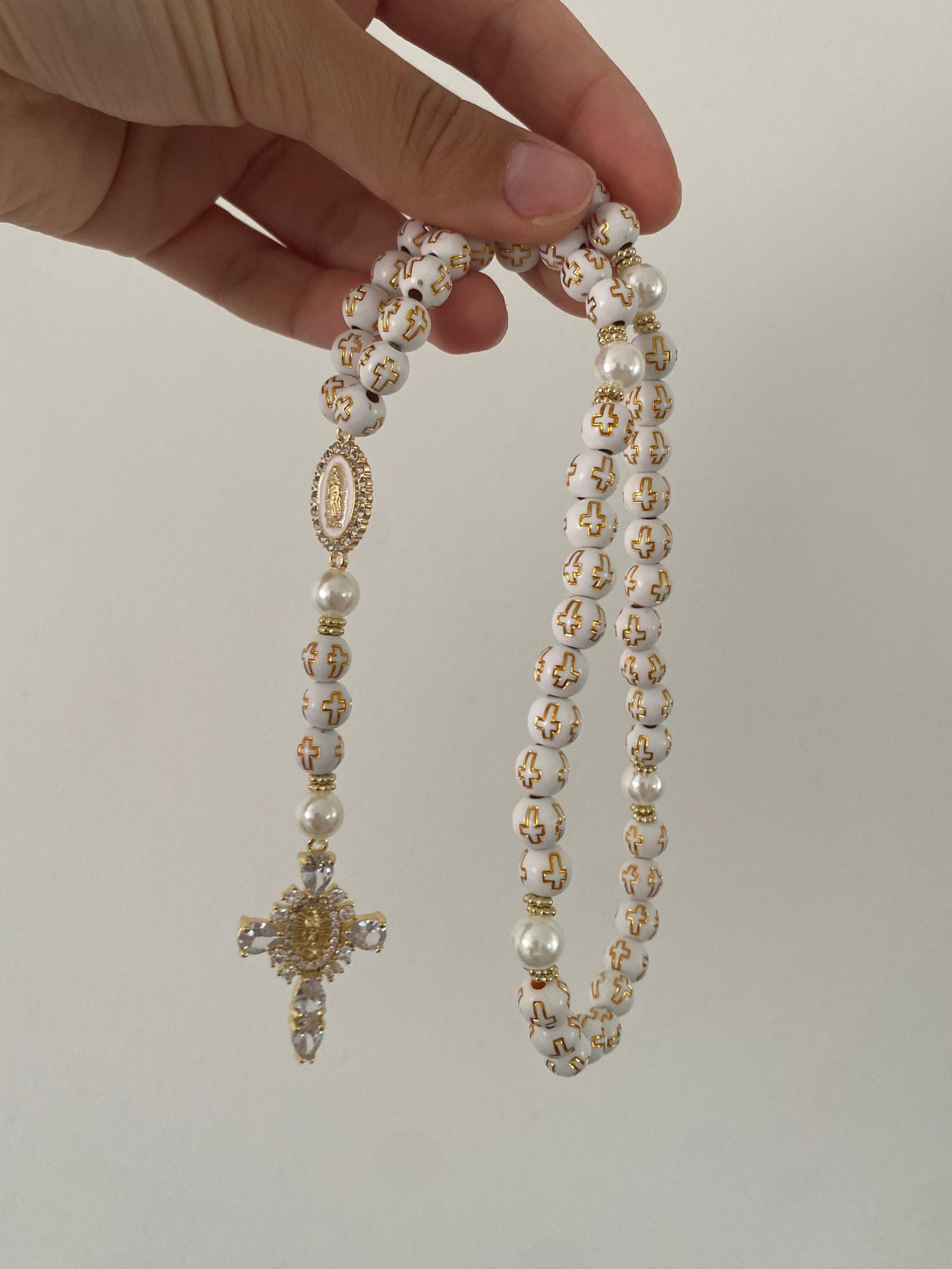 Le Chapelet Foi Doré, composé de perles blanches lumineuses se distingue par ses perles blanches décorées de petites croix dorées, rappelant la pureté, la paix et la lumière divine.