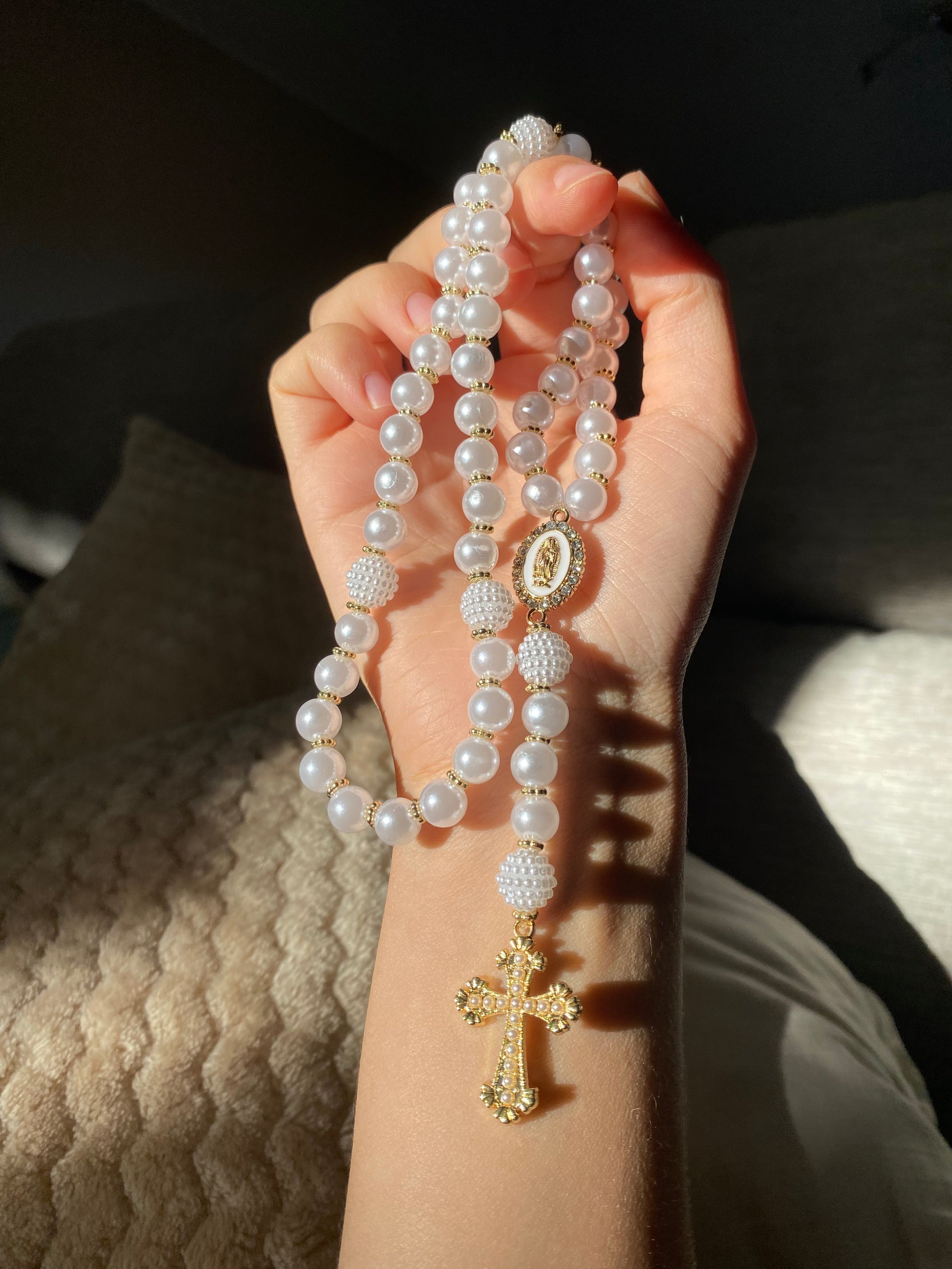 Ce chapelet blanc et doré capture l’esprit de la prière avec douceur et élégance. Chaque détail a été pensé pour accompagner un moment de paix, de méditation ou de gratitude.